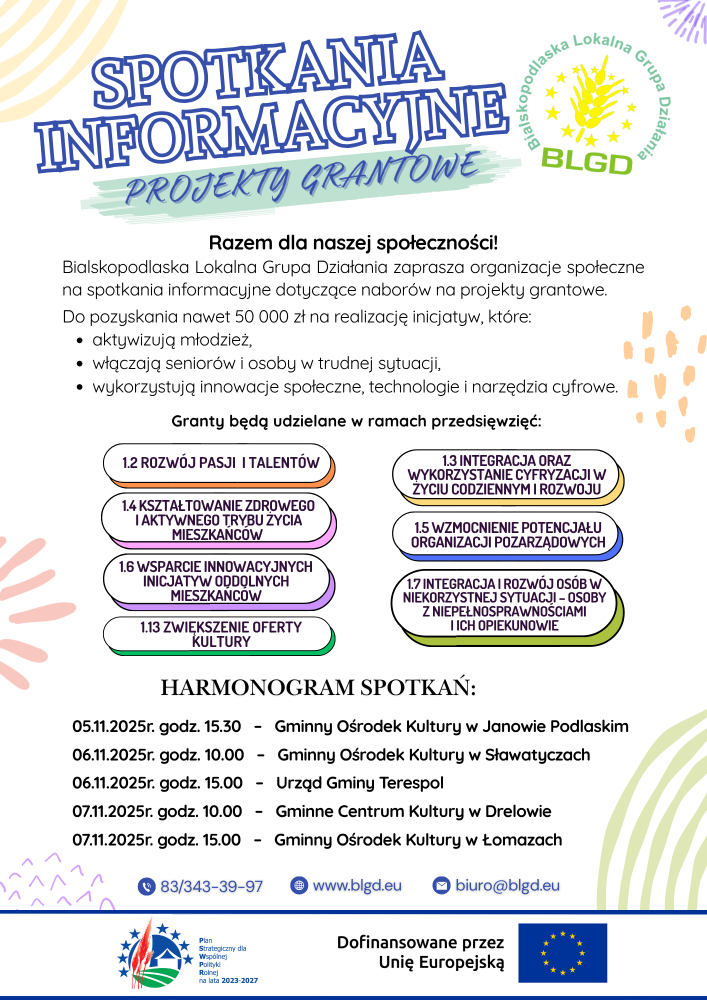 Dodatkowe informacje dotyczące projektu można uzyskać w Urzędzie Gminy Terespol pod wyżej wskazanymi nr-ami telefonu. Ogłoszenie o naborze w zakresie przyznania pomocy finansowej, zgodnie z informacją Urzędu Marszałkowskiego, ma się ukazać na przełomie grudnia/stycznia, wówczas znane będą dokładniejsze wymagania.