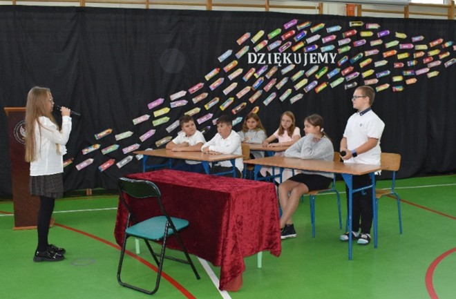 Podczas akademii Pierwszaki zaprezentowały program artystyczny, w którym z powodzeniem przedstawiły swoje umiejętności recytatorskie oraz wokalne.