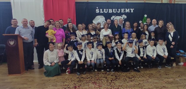 Najważniejszym momentem uroczystości było złożenie przez dzieci uroczystego ślubowania na sztandar szkoły oraz pasowanie na uczniów, którego dokonała Pani Dyrektor Katarzyna Krawczyk. Ślubowanie przebiegło w miłej i podniosłej atmosferze, w gronie dumnych rodziców, zaproszonych gości oraz starszych uczniów szkoły.